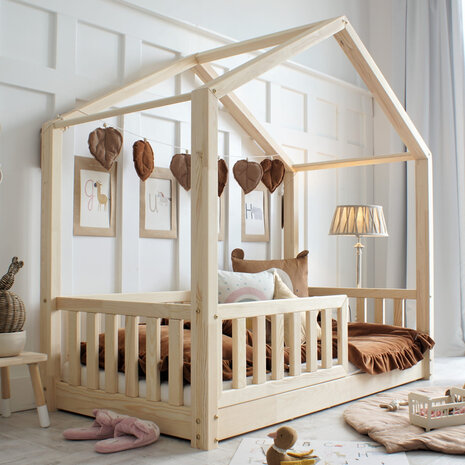 Het Luletto Basic Love Montessori huis bed is een prachtig en praktisch kinderbed, vervaardigd uit massief gelijmd grenenhout – een extra duurzame houtsoort die niet barst, nauwelijks werkt en volledig vrij is van noesten of gebreken. Dit maakt het bed niet alleen sterk, maar ook esthetisch strak en uiterst geschikt voor dagelijks gebruik. Het hout is onbehandeld, dus vrij van lak of chemische afwerkingen, en draagt zo bij aan een gezonde, ecologische slaapomgeving.