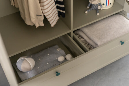 De vintage eucalyptus 2 deurs kast met lade, planken en roede is een stijlvolle en praktische toevoeging aan de kinderkamer. Uitgevoerd in de warme cashmere kleur, straalt deze kast rust en elegantie uit. De fijn gefreesde details geven het meubel een subtiele, klassieke uitstraling, terwijl de flessengroene handgreepjes zorgen voor een speels contrast.